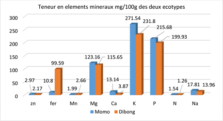 The levels of mineral elements are more or less identical for the two ecotypes studied, except for the two elements iron and calcium, for which higher levels were found respectively in dibong (99.59 ± 0.05 mg/100g) and momo (13.14 mg/100g). There was a significant difference with p > 0.05.