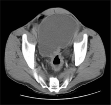 Figure 5. Abdominal CT axial section without PDC injection showing a transition zone made of stenotic thickening of the rectosigmoid hinge.