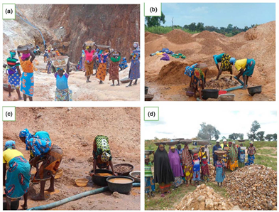 Figure 8. Women involvement in barite production in Azara, Nasarawa state (a) women transfering run-of-mine ore to designated washing point; (b), (c) washing of barite by women; (d) stacking of barite at collection (Otoijamun et al., 2021) .