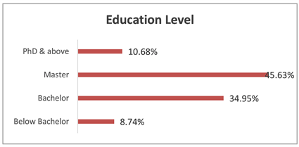 Moreover, the majority of respondents fell within the age range of 26 to 45 years old, as illustrated in Figure 2. The diversity within the age structure contributes to a nuanced comprehension of how different age cohorts perceive and engage in environmentally conscious consumption practices. Notably, a significant proportion of participants, amounting to 91.26%, held a bachelor’s degree or higher, as indicated in Figure 3. This indicates a notably high level of education among the respondents. Among the surveyed individuals, 36% identified as students, 41% as unemployed or not in the labor force, and 14% as employed (Figure 4).