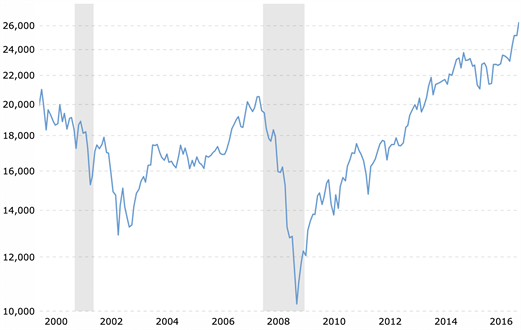 Figure 1. Simulated Brownian motion from 2000-2015 measuring Dow Jones industrial average index (Hunter, 2007) .