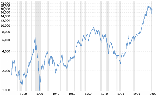 Figure 3. Simulated Brownian motion from 1900-2000 measuring Dow Jones industrial average index with the y-axis being in the thousands (Hunter, 2007) .