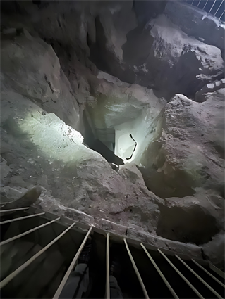 enigmatic feature of the Pyramid, the Well Shaft. The Well Shaft lower mouth is basically the only significant feature in the Descending Passage, other than the breakaway of the First Ascending Passage. Since it was a hope of the study that all the Pyramid passages and chambers would be used, the first measurement, coming to a shaft not often studied, seemed to be inviting its inclusion, somehow, into the measurements. The Well Shaft does not have definite dimensions like the other Pyramid passages. The Well Shaft varies in size at various depths and is not designed with straight lines and fixed dimensions after its initial drop toward the grotto. It is in a sense “dimensionless”, thus, in a sense, “excusing” its length from figuring into the encoding of the speed of light numbers. But this “dimensionless” passage is highlighted by having both of its ends figuring into the speed of light scheme. And these two ends, especially the upper mouth, have more definite shapes than the winding passage between them.