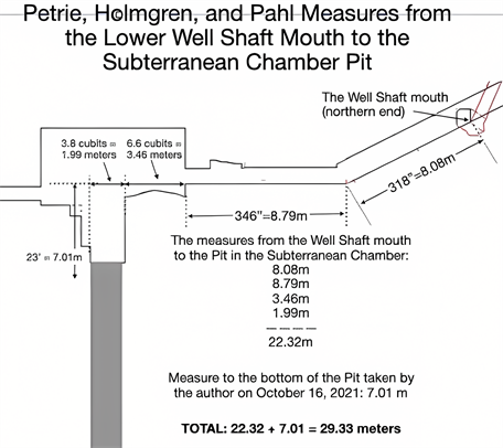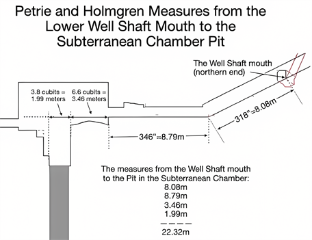 From the door of the Subterranean Chamber to the north end of the Pit (extended) is 3.46 meters and to the south end of the pit (extended) is another 1.99 meters for a total of 5.45 meters. See Figure 8. Joining this with Petrie’s measures beginning with the lower mouth of the Well Shaft (Figure 5) there are 22.32 meters to the south end of the pit (extended to the floor level.)