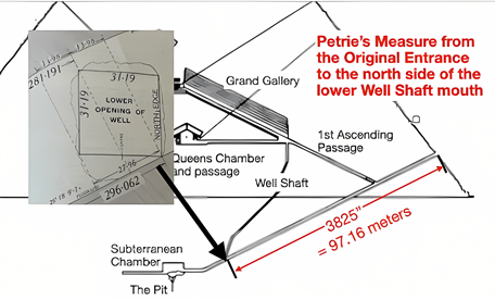 This next meter measure is a straightforward one. From the opening of the Well Shaft in the lower descending passage, the point to which the 29 meter measure took us, the next major Pyramid benchmark heading upward would be the original entrance, to the outside of the original casing stones. What is that measurement? Petrie gives the straightforward measure from the Well Shaft opening, which he calls “the lower mouth of the well shaft” (Petrie, 1990) to the outside of the pyramid at the original entrance as 3825”. This ending point (3825”) would be to northern side of the lower mouth of the Well Shaft (It would be 3856” to the southern side of that mouth). Converting to meters, that is 97.16 meters. Rounding this, we have our 97. Figure 11 provides a visual for this measure. Figure 12 is a photo of Petrie’s chart (Petrie, 1990) , which contains the measure.