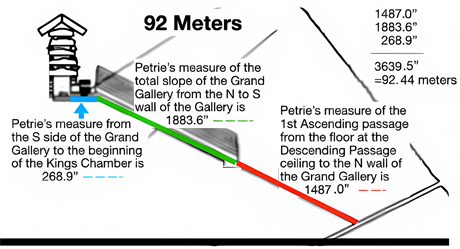 It is thus interesting and significant that the measure from the beginning of the floor of the First Ascending Passage, continuing the same line through the Grand Gallery all the way to where it virtually meets the top of the Great Step directly below the southernmost part of the Grand Gallery wall, and then continuing to move south through the Antechamber passageway to the start of the Kings Chamber is 92.44 meters.