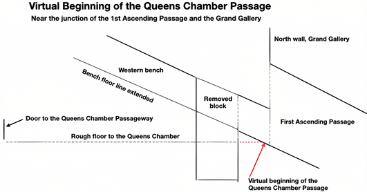 The beginning of this passage system starts, apparently, where the Queens Chamber passage floor touches the north wall of the Grand Gallery virtually, pictured in Figure 15.