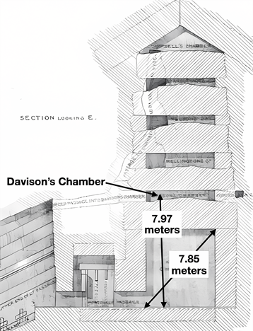 Or if we take the measure straight up from the floor of the Kings Chamber (from any point on the floor), it reaches into Davison’s Chamber. What is interesting about this 8 meter measure is that Davison’s Chamber is the highest place one could get to in the Pyramid the way it was originally constructed. It would take a very dangerous climb up the southeast Grand Gallery wall to get to the opening Davison discovered, or a long ladder precariously placed in the area of the Great Step, then angling over to the southeast corner of the Grand Gallery to the opening leading to Davison’s Chamber. Davison’s Chamber, the lowest of the five relieving chambers above the Kings Chamber, is the only one accessible by the original design of the Pyramid. Davison discovered it on July 7, 1765 (Edgar & Edgar, 1923) . The other relieving chambers were only made available through the “dynamite archaeology” of Colonel Vyse, long after the Pyramid was constructed. The blasting of Vyse commenced in 1837 (Edgar & Edgar, 1923) .