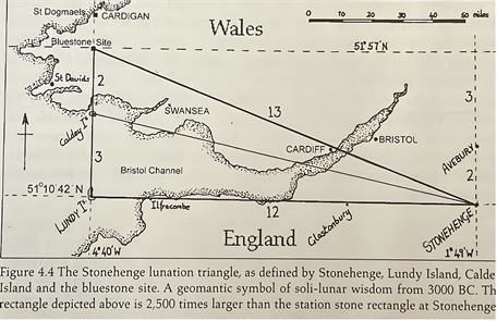 If the Great Pyramid was the only place for which a claim like this was made it would indeed be easy to shrug off. But the phenomena of evidence for advanced scientific knowledge in ancient megaliths is widespread, just not widely recognized perhaps. The works of Robin Heath (Heath & Michell, 2006) , John Michell (Michell, 1983) , John Neal (Neal, 2000) , Algernon Berriman (Berriman, 1953) , Alexander Thom (Thom, 1967) and other metrologists have made this plain, and on what, by any honest evaluation, is a scientific basis. One example of the hundreds given by these metrologists is that of the triangle formed by Stonehenge-Lundy Island and the site from which Stonehenge’s bluestones derive (Heath & Michell, 2006) . See Figure 24.