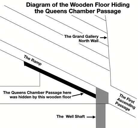The measure sure to arouse the most challenge to the thesis here is the one connecting the Well Shaft mouth to the Queens Chamber passage system. If all the measures involved only the Queens Chamber and the passage to it there would be little to contest. But the amalgamation with the Well Shaft seems at first blush to be a desperate stretch. But upon consideration, the connection has much to recommend it. First, there is reason to believe that the niches in the Queens Chamber passage, north of its entrance door were once the support for a floor that would take one coming out of the First Ascending Passage directly to the rising floor of the Grant Gallery. The Queens Chamber passageway would be entirely hidden from view. Stefan Holmgren illustrates how this could have looked in Figure 25 and Figure 26 (Holmgren, 2023) .