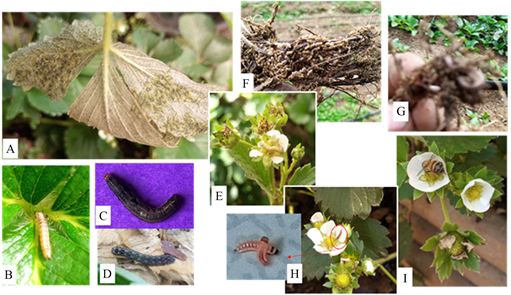 Figure 8. Damage observed in Fragaria sp. plant in the field. Aspects of pest attacks (A, B, C, D, E, F, G, and H) in leaves and roots of Fragaria sp., and pollinators (I) identified in the strawberry fields during the surveys. Data obtained during the survey carried out from January 2021 to February 2022.