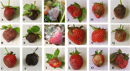 Figure 6. Disease expression on Fragaria sp. fruits in the different farms visited. Strawberry fruit rot (A, B, C, d, E, and F), strawberry powdery mildew (G, H, and I), Necrosis (J, and K), Pink soft rot (L), White patches (M, N, and O), brown-coloured soft (P, and Q), and grey mould (R). Data obtained during the survey carried out from January 2021 to February 2022.