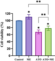 Figure 1. Effect of ATO and ME on cell viability. (a) Effect of different concentrations of ATO on cell viability; (b) Effect of different concentrations of ME on cell viability. *: statistically significant difference with control group, P < 0.05.