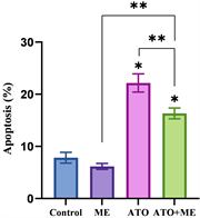 In the Hoechst 33,258 fluorescent staining assay, the nuclei of control cells and ME-treated cells showed an oval round shape with homogenous intensity and were very lightly stained, whereas cells treated with ATO were found in a condensed and/or fragmented shape with irregularity and bright staining (Figure 2(c)). These apoptotic morphological changes showed greater difference in cells simultaneously treated with higher doses of ATO. As shown in Figure 2(d) and Figure 2(c), there was no significant difference between the ME group and the control group in apoptotic morphological changes, and there was no significant difference in the apoptotic rate between the two groups (p > 0.05). After ME treatment, the morphological changes of apoptosis induced by ATO decreased significantly, and the apoptosis rate decreased. The rate of apoptosis in the ATO group was 2.88 times of that in the control group, whereas, after ME treatment, the rate of apoptosis in the ME + ATO group was 2.11 times of the control group. These results indicate that ME treatment can reverse ATO-induced apoptosis.