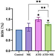 As shown in Figure 3(a), ATO exposure led to the accumulation of reactive oxygen species, but ME treatment facilitated the ATO-induced removal of ROS. Fluorescence quantitative results further showed that treatment with ATO and ATO + ME led to an 49% and 29% increase on ROS production in comparison to control cells (Figure 3(b)).