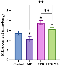 In order to comprehensively evaluate the degree of oxidative damage, we further detected the SOD activities and MDA contents in ME-treated, ATO-treated and ATO + ME-treated NIT-1 cells. The results demonstrated that SOD activity respectively were 95.98 U/mg protein, 69.66 U/mg protein, or 76.82 U/mg