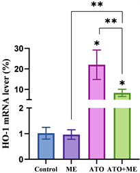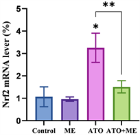 An increase in Nrf2 and HO-1 mRNA levels was clearly observed in the ATO group, while Nrf2 and HO-1 mRNA levels were lower in the ME + ATO group compared to the ATO group, as shown in Figure 4. For ATO group and ME + ATO group, the HO-1 mRNA levels were 21.65-fold and 8.17-fold of untreated group respectively (P < 0.05), the Nrf2 mRNA levels were 3.05-fold and 1.42-fold of untreated group respectively (P < 0.05). Incidentally, both Nrf2 and HO-1 mRNA levels of the ME group were slightly lower than in the untreated group.