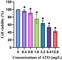 The cell viability was detected with a CCK-8 kit (Nanjing Jiancheng Institute of Biological Engineering). NIT-1 cells were seeded into in 96-well plates at density of 1 × 105 cells/well, and cultured for 24 h at 37˚C in 5% CO2 incubator. Cells were treated with diferent concentrations (0, 0.4, 0.8, 1.6, 3.2, 6.4, 12.8 mg/L) of ATO (Arsenic trioxide (As2O3, Beijing Tanmo Quality Control Technology Co., Ltd.) and different concentrations (0, 40, 80, 160, 320, 640, 1280 mg/L) of ME for 24 h. Then, the toxic liquid was discarded and the cells were incubated in a medium mixed with 10 µL CCK8 solution and 90 µL 1640 at 37˚C, 5% CO2, and 90% humidity for 4 h. The absorbance was subsequently measured at 450 nm with a multifunctional fuorescent plate instrument (SP-Max3500FL, Flash Biotechnology Co., Ltd., Shanghai, China). Cell survival rate was calculated according to cell survival rate = [(experimental hole − blank hole)/(negative control hole − blank hole)] × 100%.