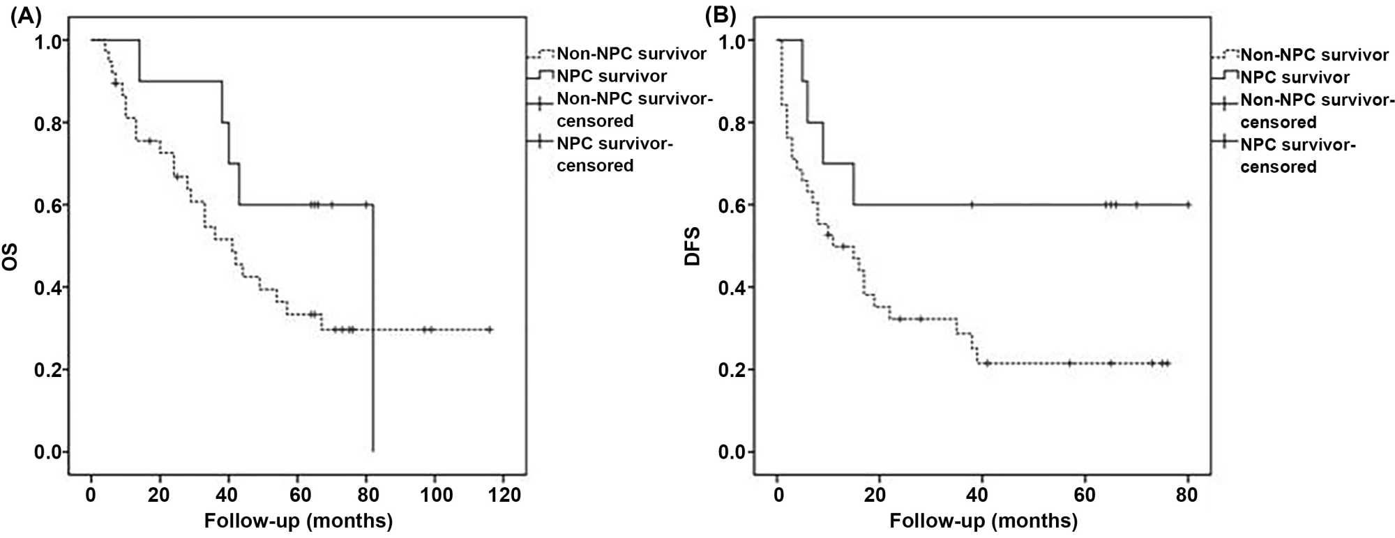 Figure 1. OS and DFS of NPC survivors and non-NPC survivors. (A) OS of NPC survivors and non-NPC survivors showed no significant difference. (B) NPC survivors showed a trend of better DFS than non-NPC survivors, but the difference showed no significance (P = 0.055). OS: overall survival; NPC: nasopharyngeal carcinoma; DFS: disease free survival.