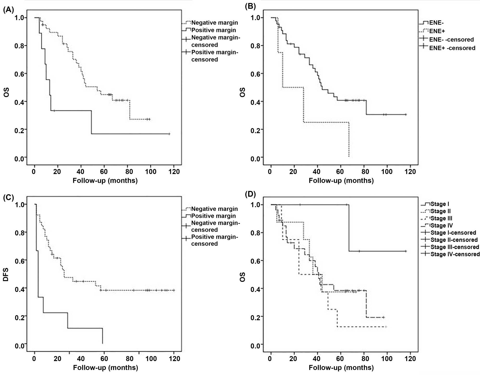 The 3- and 5-year OS was 60.3% and 39.4%, and the 1-, 2-, 3- and 5-year DFS was 75.0%, 38.3%, 35.8% and 30.4%, respectively. Margin status (P = 0.002, HR = 4.033, 95% CI: 1.643 - 9.899) and ENE (P = 0.050, HR = 2.765, 95% CI: 0.954 - 8.012) were significantly associated with OS; and margin status was also significantly associated with DFS (P = 0.002, HR = 3.538, 95% CI: 1.608 - 7.782). However, age (P = 0.151, HR = 0.582, 95% CI: 0.274 - 1.234), gender (P = 0.519, HR = 0.783, 95% CI: 0.371 - 1.652), alcohol consumption (P = 0.388, HR = 1.886, 95% CI: 0.447 - 7.962), smoking (P = 0.161, HR = 2.138, 95% CI: 0.740 - 6.183), clinical stage (P = 0.497, HR = 1.345, 95% CI: 0.571 - 3.167), lymph node metastasis (P = 0.866, HR = 1.071, 95% CI: 0.483 - 2.377) and tumor differentiation (P = 0.505, HR = 1.434, 95% CI: 0.497 - 4.141) were not significantly associated with OS. The multivariate analysis showed that only margin status was a significant independent prognostic factor of OS (P = 0.003, HR = 3.976, 95% CI: 1.596 - 9.904) (Figure 2).
