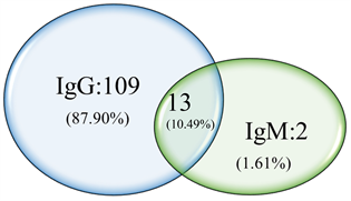 Of the 270 study participants, 124 (45.9%) were positive for SARS-CoV-2 antibodies; either IgG, IgM, or both, while 146 (54.1%) study participants were seronegative. As seen in Figure 1, 109 were IgG-positive only, 2 were IgM-positive only, and 13 participants were positive for IgG and IgM.