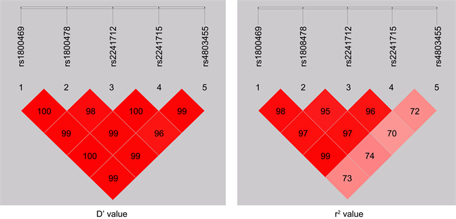 SHEs is online tool was used for Linkage disequilibrium analysis. There is a strong linkage disequilibrium between these 5 SNPs (rs1800469, rs1800470, rs2241712, rs2241715, rs4803455). The results are shown in Figure 1.