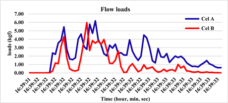 The load results were plotted on a loads (cell A and B) × time graph where it was possible to observe the load variation records with the impact waves, from which the peak load value of the impact waves is taken. This maximum impact pressure load occurs over a maximum period of two seconds and the values can also be compared with velocity, flow and displacements where relevant relationships can be extracted. Figure 7 shows a graph of an experiment carried out on