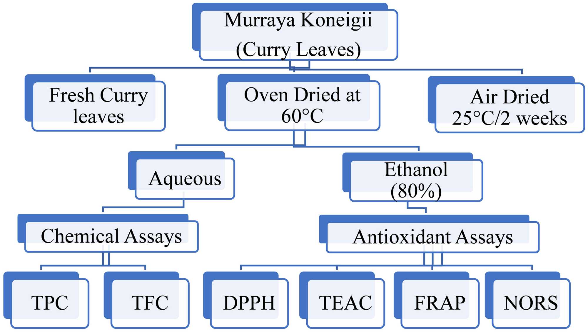 All experiments were carried out in triplicates, and data were recorded as means ± standard deviation. For the chemical analysis of curry leaves extracts, factorial design (3*2) was followed with 3 treatments (Fresh, Oven-dried at 60˚C, and Air-dried), and 2 solvents (Aqueous and Ethanol) for extraction of bioactive compounds. For the enzymatic analysis of curry leaves extracts, factorial design (3*2) was followed with 3 treatments (Fresh, Oven-dried at 60˚C, and Air-dried), and 2 solvents (Aqueous and Ethanol). SAS 9.2 was used to conduct ANOVA (Analysis of variance). Tukey’s studentized range test was used to evaluate significant differences between means, and (p ≤ 0.05) considered as significant. (Figure 1)