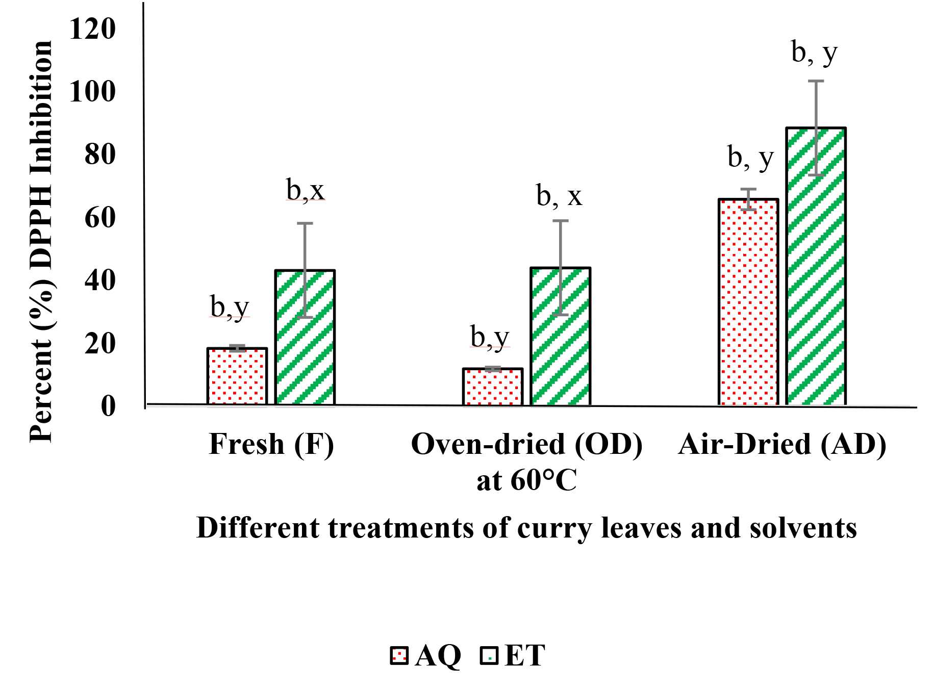 There were significant (p ≤ 0.05) differences between the solvent type and thermal processing methods for the phenolics. The total phenolic content was higher in Ethanol solvent extracts when compared to Aqueous solvent extracts, where TPC for Ethanol extracts was about 32 folds higher than Aqueous for Fresh curry leaves extracts. Additionally, it was 10 folds and 65 folds higher for OD and AD. Phenolic compounds have been shown to contribute to the antioxidant properties of plant substances [33].