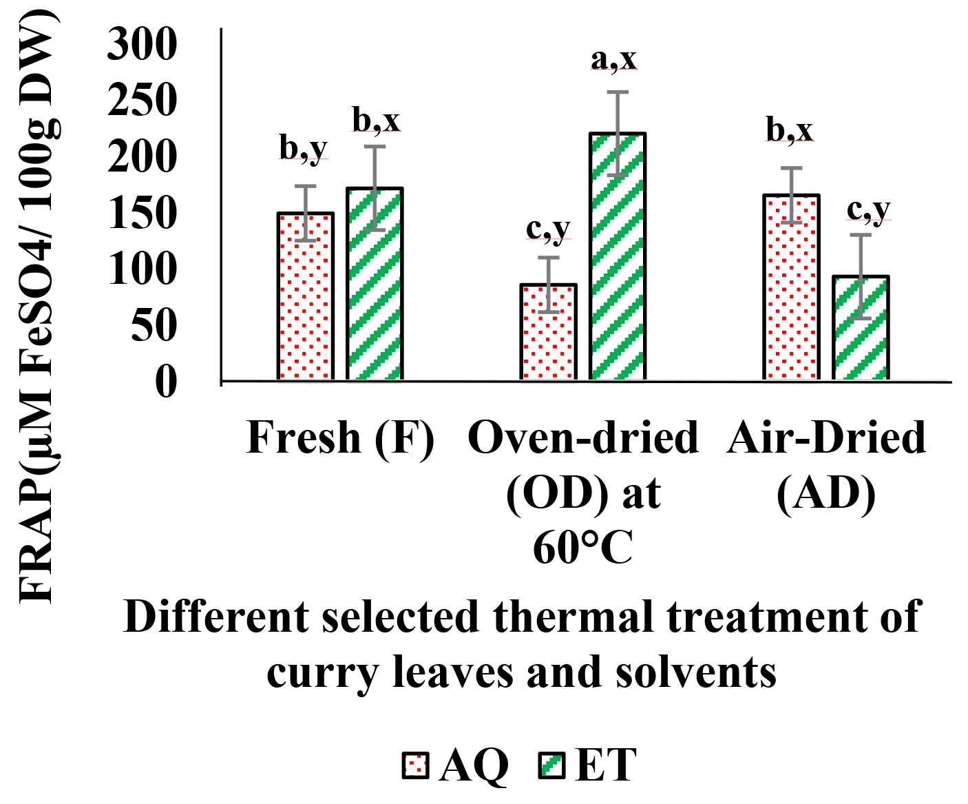 The FRAP results are also presented in Figure 2(b). The ability to convert Fe3+ to Fe2+ through reduction serves as an indirect indicator of the antioxidant potential of an extract or compound [37]. While the FRAP activity in Ethanol solvent for Fresh and OD at 60˚C was higher than in Aqueous solvent, the trend was reversed for AD. Specifically, the observed FRAP values were about 15% and 156% higher in Ethanol for fresh and OD respectively, when compared to Aqueous. On the contrary, the FRAP values were about 77.5% higher in Aqueous for AD compared to Ethanol extracts. Previous research has shown that ethanol extracts of curry leaves exhibit the most significant reducing power among all tested samples when compared to alternative solvents [38]. This highlights the variability in FRAP values between (E) and (A) extracts under different drying conditions, indicating that the choice of solvent and sample preparation method can significantly impact the antioxidant activity measured by the FRAP assay.