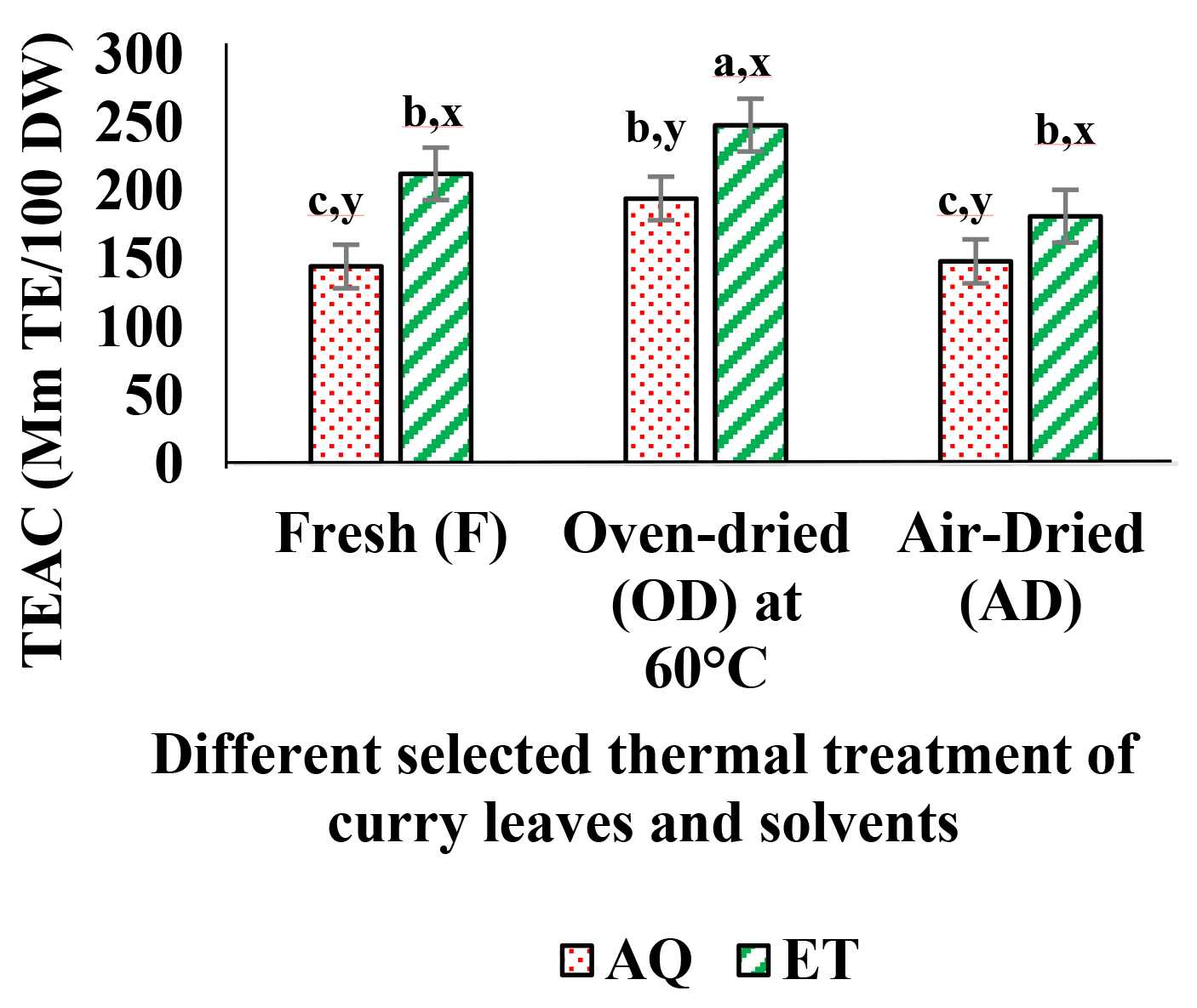 TEAC values significantly (p ≤ 0.05) increased by approximately 46.9% in Ethanol extracts of fresh curry leaves when compared to Aqueous extracts. In curry leaves extracts for oven-dried at 60˚C, TEAC follows a similar trend of higher values for Ethanol when compared to Aqueous with an increase of approximately 27.7%. Likewise, for the air-dried curry leaves extracts, TEAC values were significantly (p ≤ 0.05) higher (22.3%) in Ethanol extracts when compared to Aqueous extracts. Since a higher TEAC value indicates greater antioxidant activity, implying that the substance has a stronger ability to neutralize free radicals and oxidative stress. While the TEAC was higher for Fresh curry leaves but the difference was also significant when using either OD at 60˚C or AD.