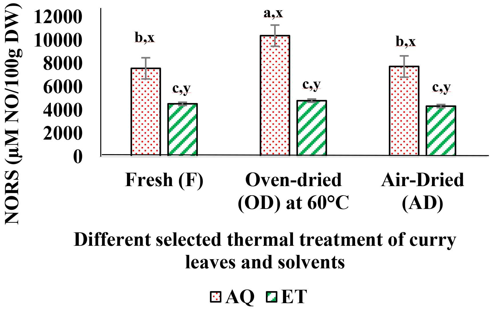 (a) DPPH—2,2-Diphenyl-1-Picrylhydrazyl (b) FRAP-Ferric Reducing Antioxidant Capacity, (c) TEAC— Trolox Equivalent Antioxidant Capacity, (d) NORS—Nitric oxide radical scavenging, DW—Dry Weight. Treatments-Fresh (F), Oven-dried at 60˚C, Air-Dried (AD), Solvents: AQ-Aqueous ET-Ethanol 80% Bars with superscripts: a,b,c-(Thermal Processing), x,y-solvents are significantly different (p ≤ 0.05).