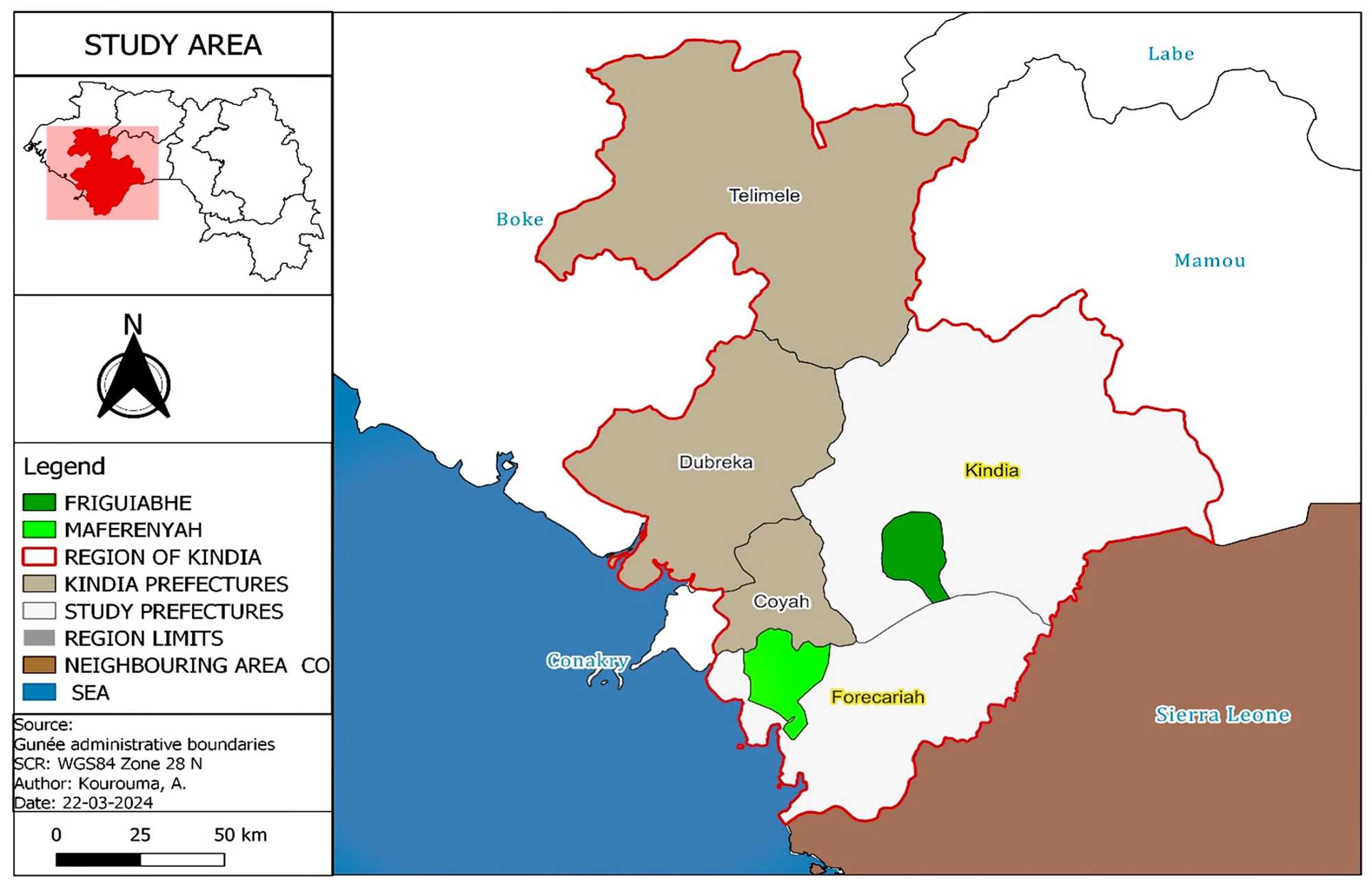 Figure 1. Map of the Republic of Guinea (right and top) showing the Kindia region.
