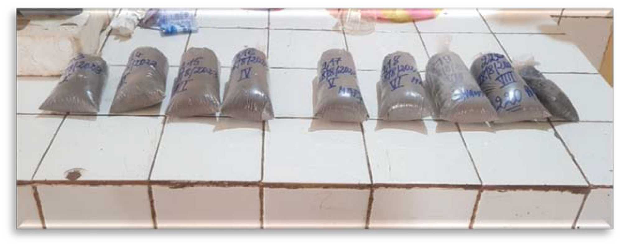 The soil samples (Figure 2) used for this study were collected using a jar and shovel in the prefectures of Kindia (Friguiagbe) and Forécariah (Maferinya) in the Republic of Guinea between 9 am and 12 pm. The soil surface was cleaned to remove any organic or other residues, then the shovel was driven into a depth of 20 cm, and the samples were taken to the laboratories to be dried, conditioned and then analysed.