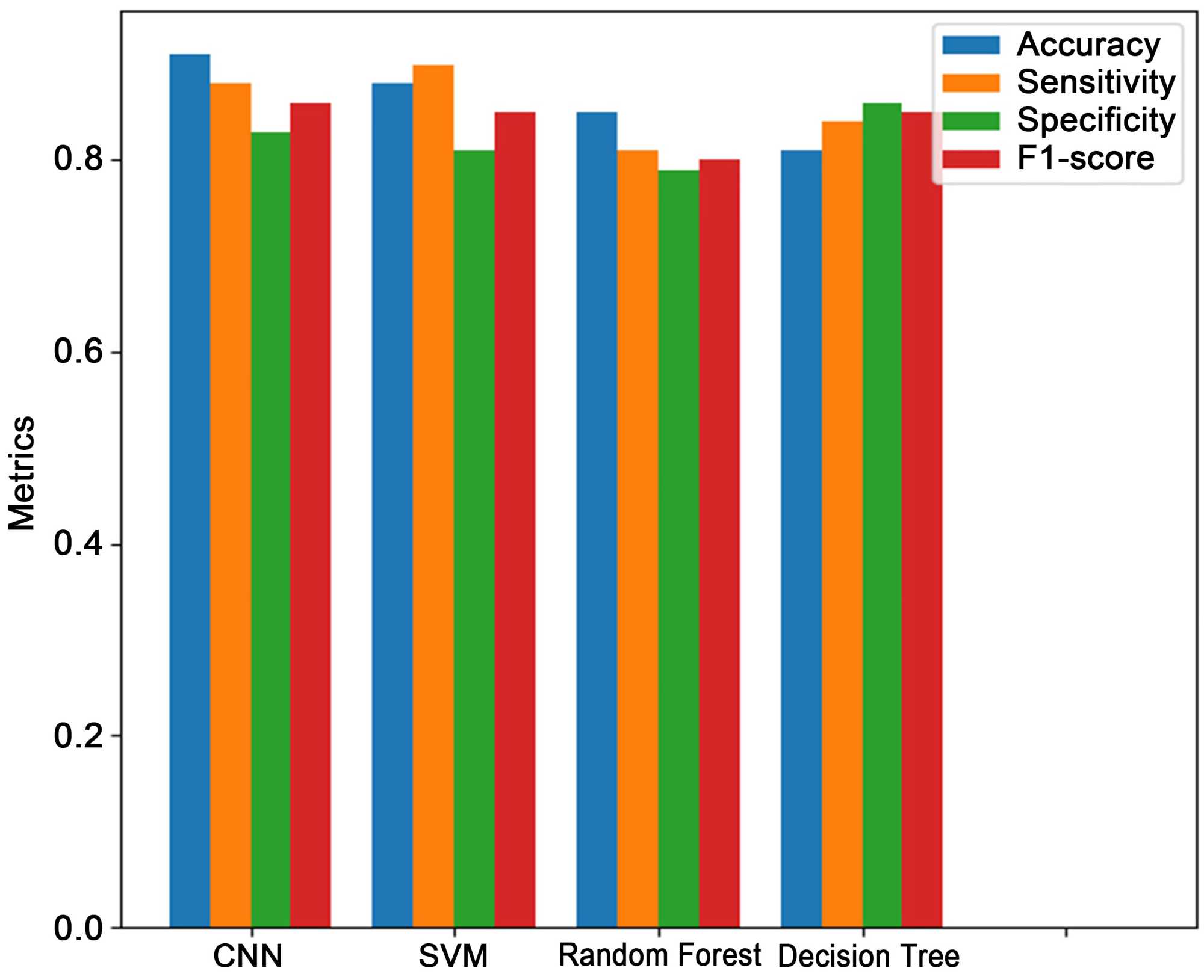 The classification efficacy of a model can be achieved through the integration of specificity, recall, accuracy, precision, and the harmonic mean in the case of the F1-score. The utilization of these metrics is critical when assessing the precision and accuracy of predictions made by various algorithms. As shown in Table 2 and Figure 2, the CNN model is effective for a variety of chronic disorders. The CNN model exhibits a high degree of false positive avoidance and consistent true positive identification, which enables it to accurately diagnose patients with a diverse array of chronic diseases. The CNN model is contrasted with conventional algorithms such as SVM, Decision Tree, and Random Forest in Table 3 and Figure 3. CNN’s proposed method outperforms alternatives across multiple criteria. CNN outperforms SVM, Random Forest, and Decision Tree in predicting chronic diseases, according to the findings.