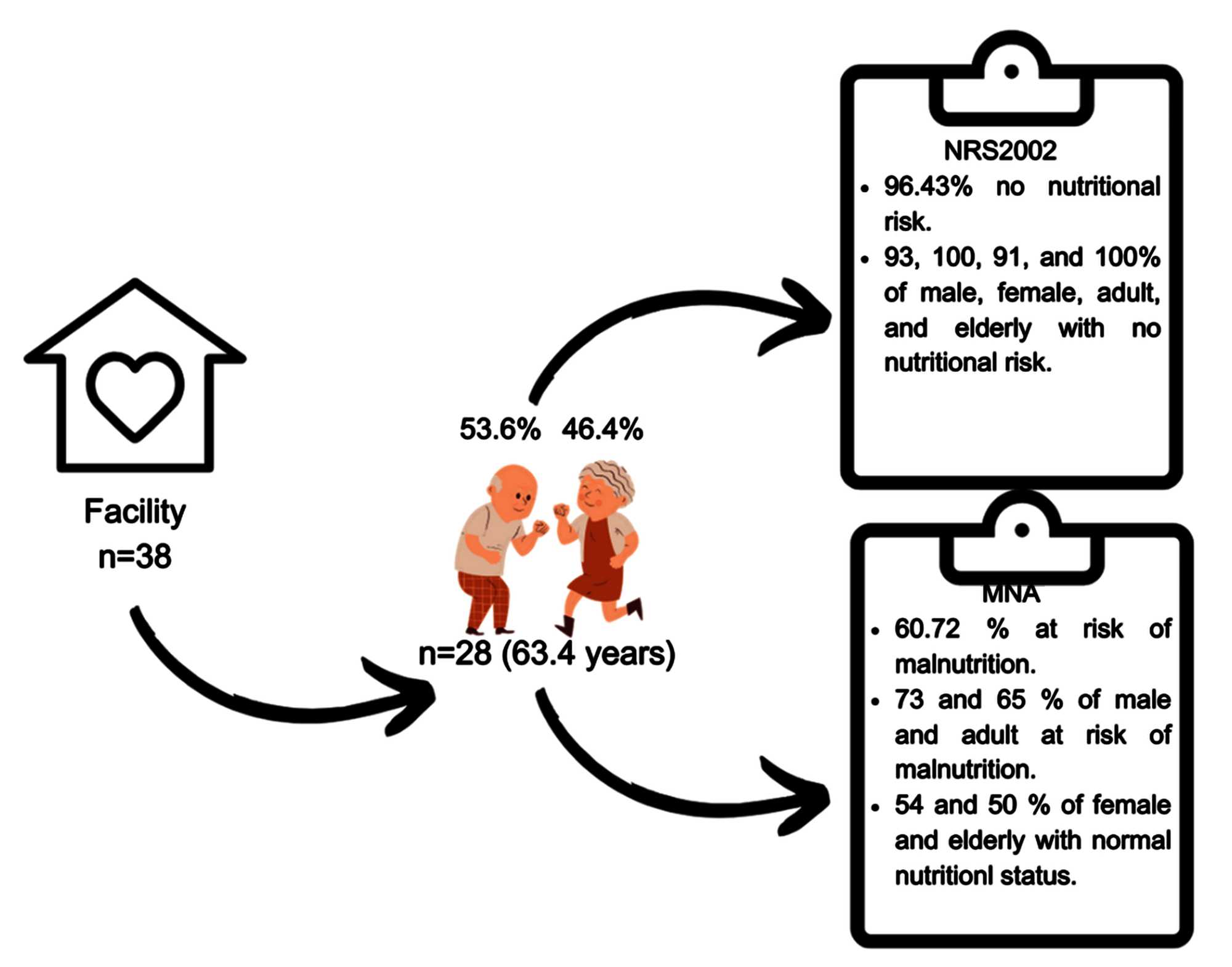 Finally, this work also has limitations, including the sample size used in the study, which was limited due to the variability of short-term residents at the facility. Also, in this work, due to the limitation of research execution time and although we considered the recommendations of government agencies, we included only two screening tools (NRS 2002 and MNA), and we could also have included the Malnutrition Universal Screening Tool (MUST) and Subjective Global Assessment (SGA). However, we chose to remove MUST because it was a tool developed for hospitalized individuals (a situation already covered by the NRS 2002) and SGA because its relationship with patient classification and outcome had not been discussed much in the literature [13].