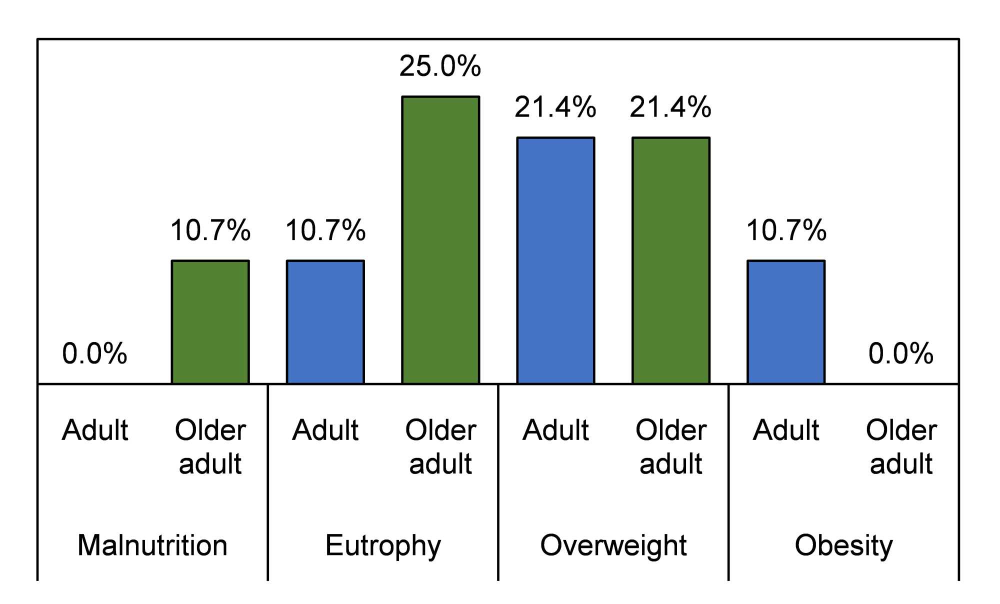 Figure 2 presents the classification of nutritional status according to age group. Most elderly individuals (25%) demonstrated a nutritional diagnosis according to the BMI within the eutrophic range (Figure 2), while for adult individuals, the majority (21.4%) demonstrated within the obesity range. Sousa et al. [22] demonstrated in their study a similar result to the present study, where in a population of 131 older adults, the majority were classified within the BMI range of overweight (~50%) and normal weight (~48%).