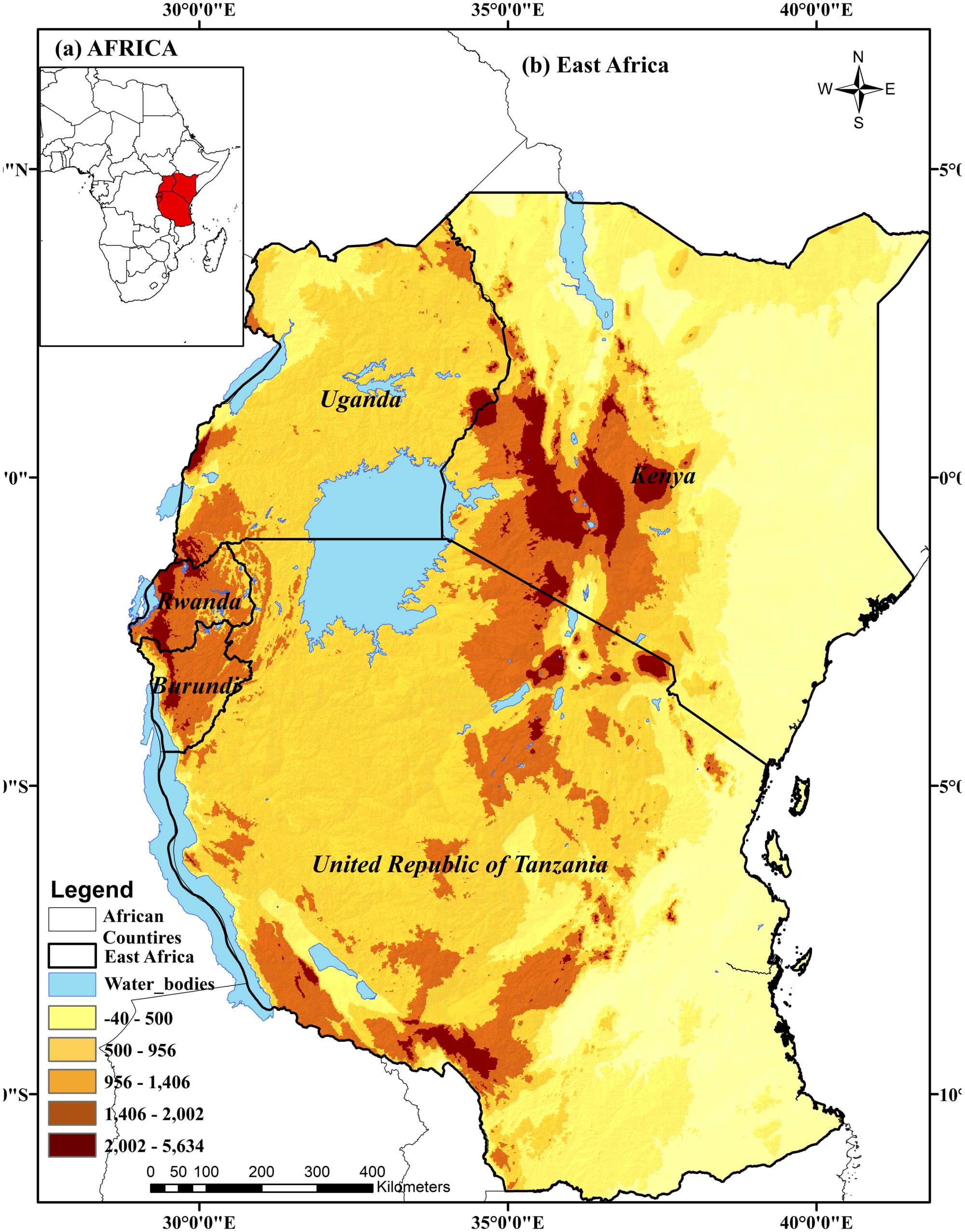 East Africa (EA) is located in the equatorial belt with a geographical coordinate of 11.72˚S-5.1˚N latitude and 28.7˚E-41.91˚E longitude as it is shown in Figure 1. It has five countries: Rwanda, Burundi, Uganda, Tanzania, and Kenya. The topography of EA is remarkable; there is the East African Rift Valley created by global plate tectonic forces; numerous mountains with high elevation in Africa like Mount Kilimanjaro (5895 m) and Mount Kenya (5197 m); various water bodies cover up some parts of the region like Lake Victoria, Lake Tanganyika, Lake Albert, Lake Turkana, and Lake Kivu.