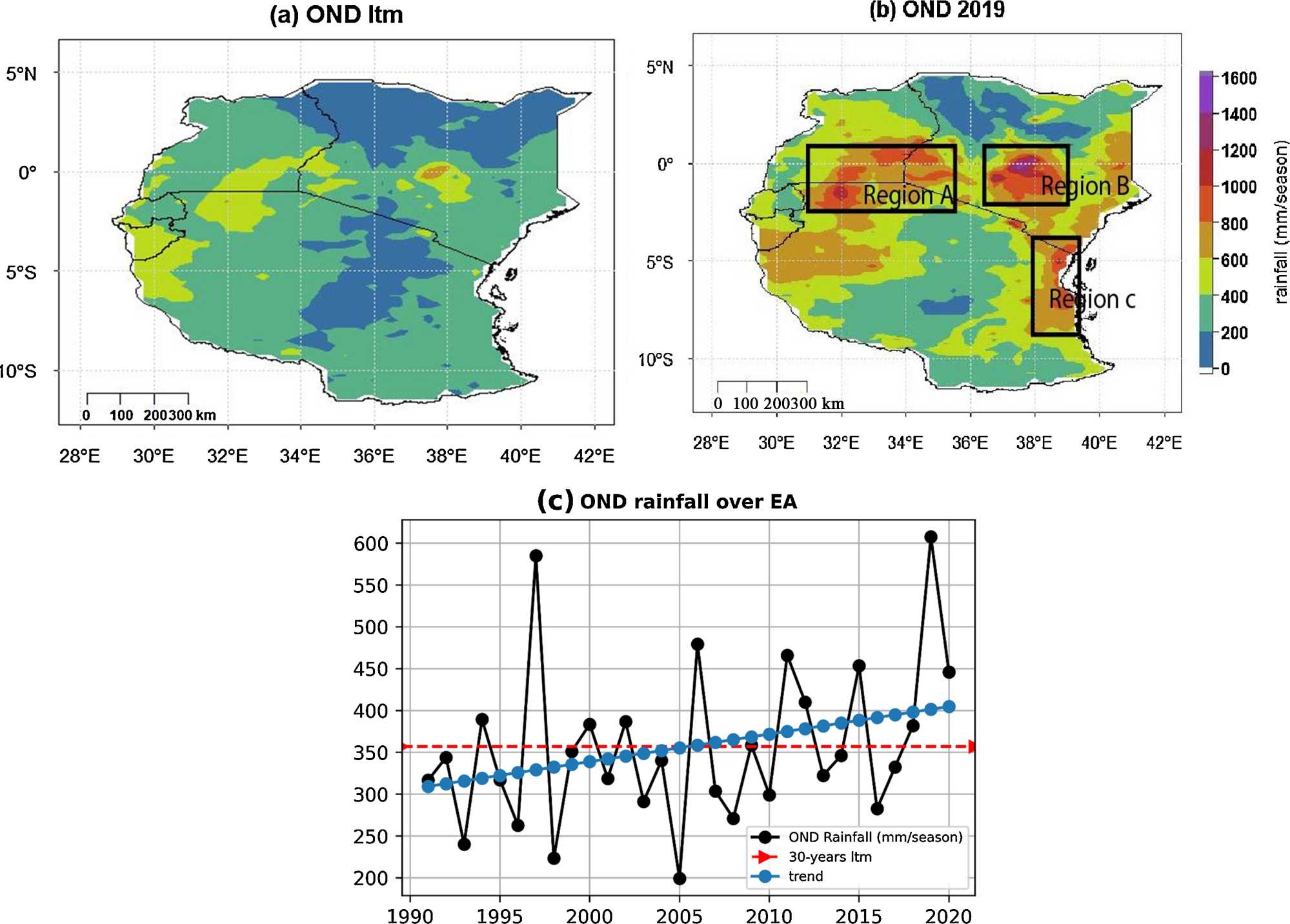 rainfall, which is associated with increased local circulation in the regions. For instance, the area-averaged rainfall of central Kenya (region B) has the highest rainfall, approximately 130% (900 mm) above the climatological average for the OND season. Figure 2(c) illustrates the time series of OND rainfall. Over EA over 30 years since 1991 to 2020, generally the whole region of East Africa indicates an increase in rainfall for the OND period. As there has been a decline in rainfall for some years, the OND 2019 had 600 mm/season averaged rainfall over the whole region of EA, as the mean is estimated to be around 355 mm/season.