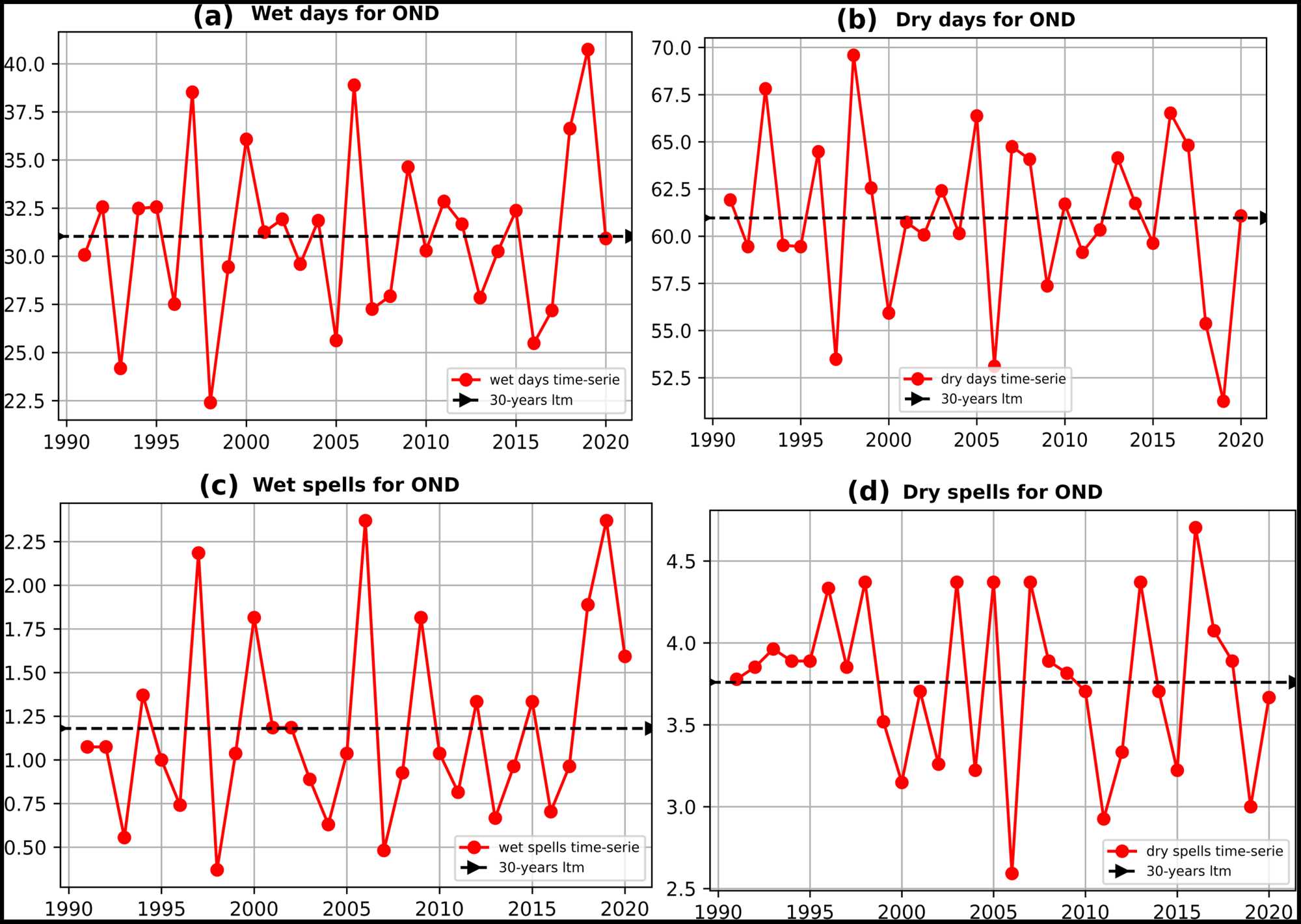 Figure 3 illustrates the trend of annual OND seasonal rainfall, wet (dry) days, and wet (dry) spells. The analysis of the wetness (days with more than 0.85 mm)