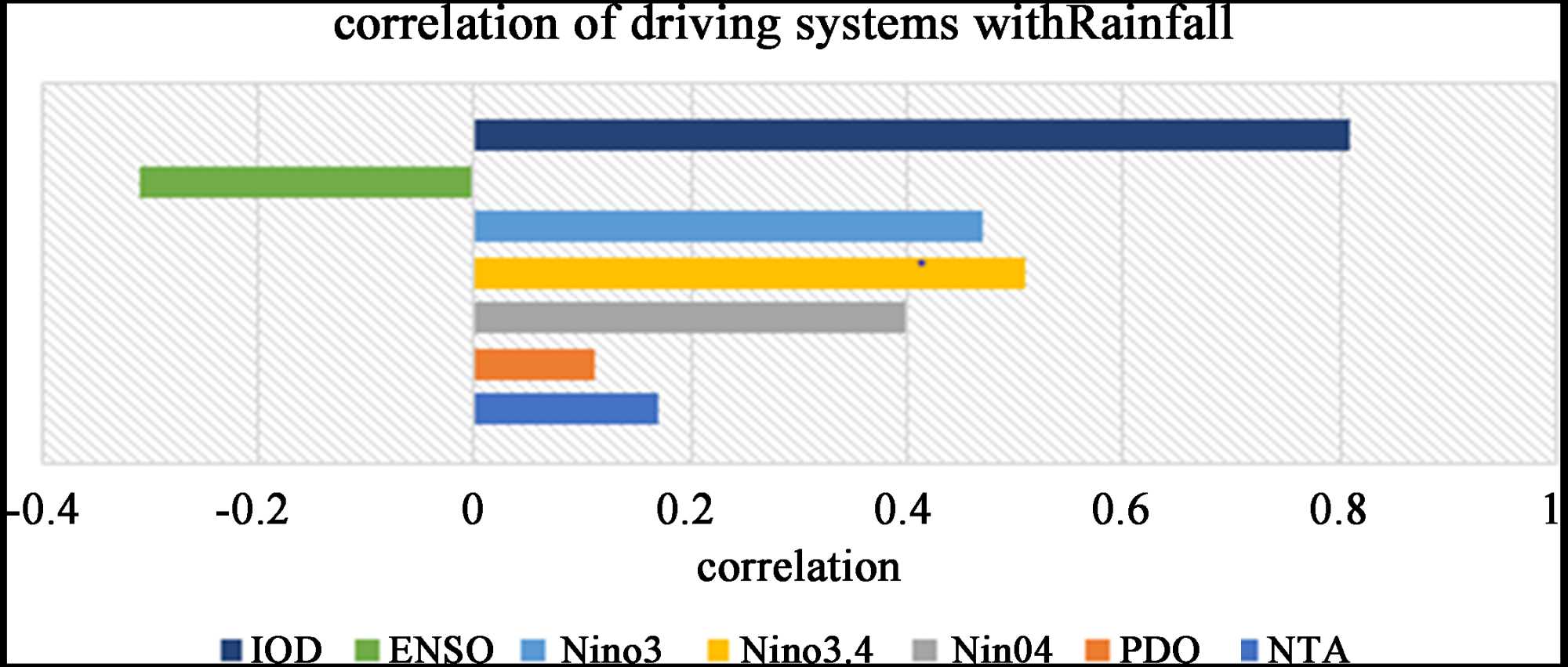 high and significant positive value of correlation coefficient for IOD is indicated (0.81) as other driving systems have fair values correlation coefficient (Nino 3.4, Nino 3, Nino 4), PDO and NTA have low positive correlation coefficient and ENSO have negative correlation coefficient (Figure 6).