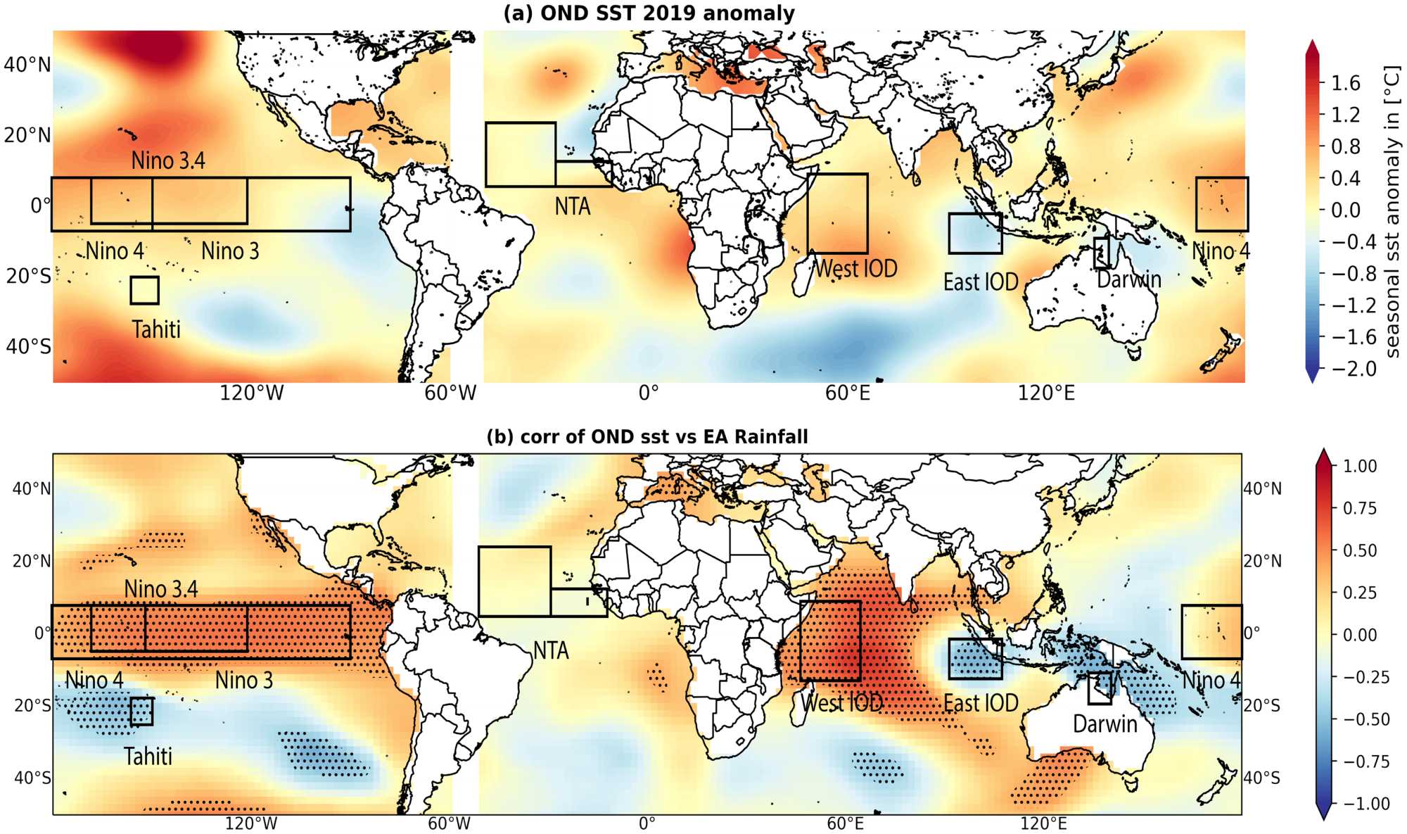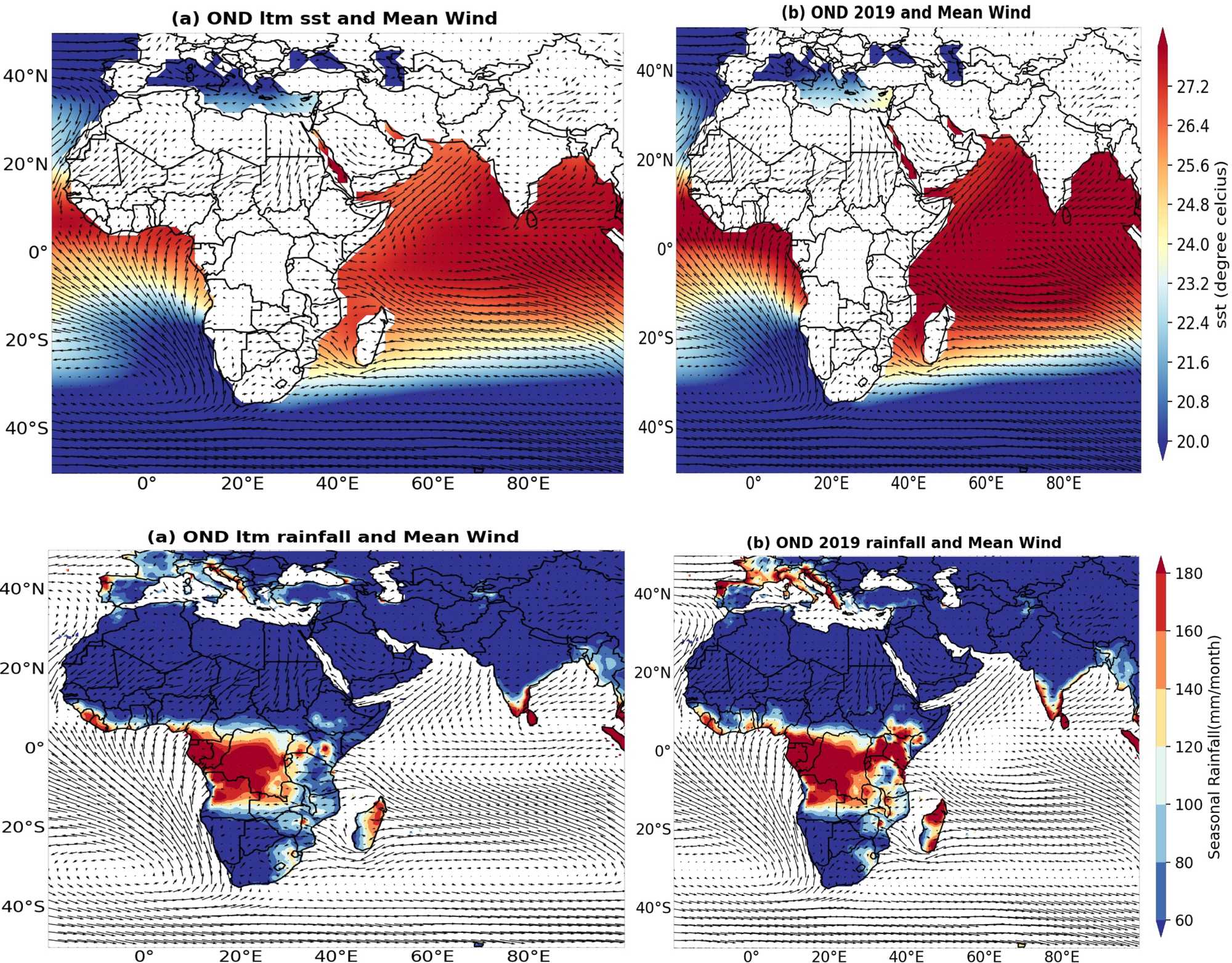 The 21st century has witnessed an increase in extreme weather events and climate variability, including droughts, torrential rains, and floods. These events lead to water and food shortages, energy deficits, and socio-economic disruptions (Woodward et al., 2016). East Africa (EA) is one of the regions of Africa with high intra-seasonal to inter-annual rainfall variability (Lüdecke et al., 2021). The EA experiences rainfall bimodality, with the short rainy season extending from October-November-December (OND) being noted for its exceptionally extreme rainfall (Doi, Behera, & Yamagata, 2022; Wainwright et al., 2020). During OND 2019, EA witnessed a crucial period where several parts of the region experienced one or more extreme rainfall events due to its variability in occurrence and intensity compared to the previous rainfall (Lüdecke et al., 2021; Woodward et al., 2016). Over the region, rainfall is the climate variable with the most impacts, where above-normal rainfall events result in extreme rainfall events such as flooding and landslides, among others, while the deficit results in dry spells, which may lead to drought and consequently famine (Krüzselyi et al., 2011; Shrivastava & Umar, 2023). EA rainfall variability is linked to various driving systems associated with the patterns of sea surface temperatures (SSTs) over the Indian, Pacific, and tropical Atlantic Oceans and regional wind circulations (Roy, Mliwa, & Troccoli, 2023; Varada, 2005). These global synoptic phenomena include and are not limited to the Indian Ocean Dipole (IOD) (Black, 2005; Finney et al., 2020; Palmer et al., 2023; Wainwright et al., 2020), the El Nino-Southern Oscillation (ENSO) (Indeje, Semazzi, & Ogallo, 2000; Nicholson, 2017; Ogallo, 1988; Palmer et al., 2023; Vashisht & Zaitchik, 2022), Atlantic variability (McHugh & Rogers, 2001), zonal equatorial easterlies (Jury, Matari, & Matitu, 2009), and the Southern Annular Mode (SAM) (Mbigi & Xiao, 2023).