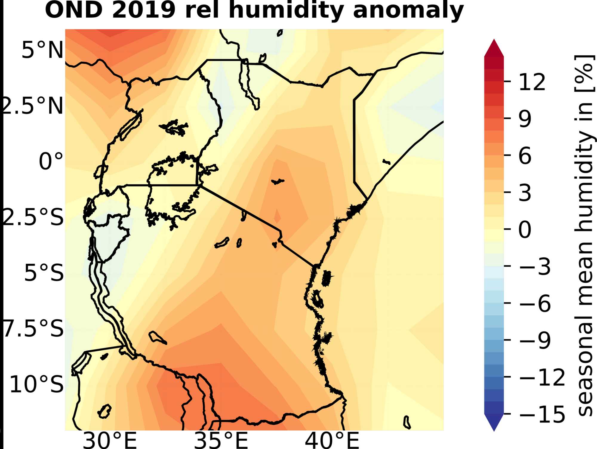 Figure 8 shows the relative humidity anomalies during the 2019 OND season throughout the land. The climatology period from 1991 to 2020 is used to calculate the season mean climatic anomaly (just the climatological mean subtracted, not normalized). For the period of OND 2019, the relative humidity anomalies are higher over EA. The east and central regions of EA exhibit a positive anomaly with values ranging from 9% to 12%, which suggests an increase in atmospheric humidity. Almost all of the air in these regions is saturated with deep convective inflow, which tends to move upward as the atmosphere warms and prevails in rainfall activities over the region. The increase in relative humidity across EA signifies a rise in the airborne water vapor pressure relative to the amount of water that could be retained as vapor at that temperature. These findings also point to an increase in rainfall across most of the region, particularly in areas that experienced unusually high rainfall during the 2019 OND period.