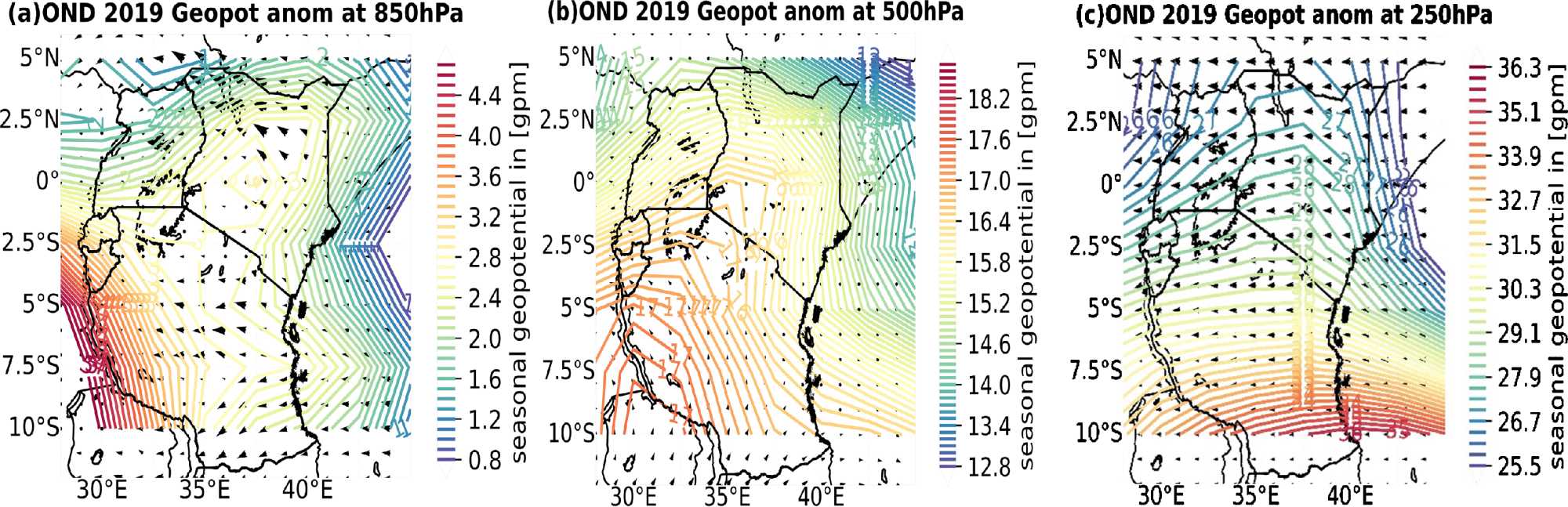 Figure 9 shows the geopotential height anomalies for the OND 2019. The majority of EA region observed a negative geopotential heights anomaly with strong winds at 850 hPa (Figure 9(a)) resulting in convective atmosphere over EA. At middle troposphere levels of 500 hPa, the low geopotential height is also accompanied by strong winds over the central and northern region (the region located around the Lake Victoria, the whole region of Kenya and Uganda), resulting in the presence of storms or troughs over these regions, while the south region (the entire region of Tanzania) has a relatively high geopotential height,