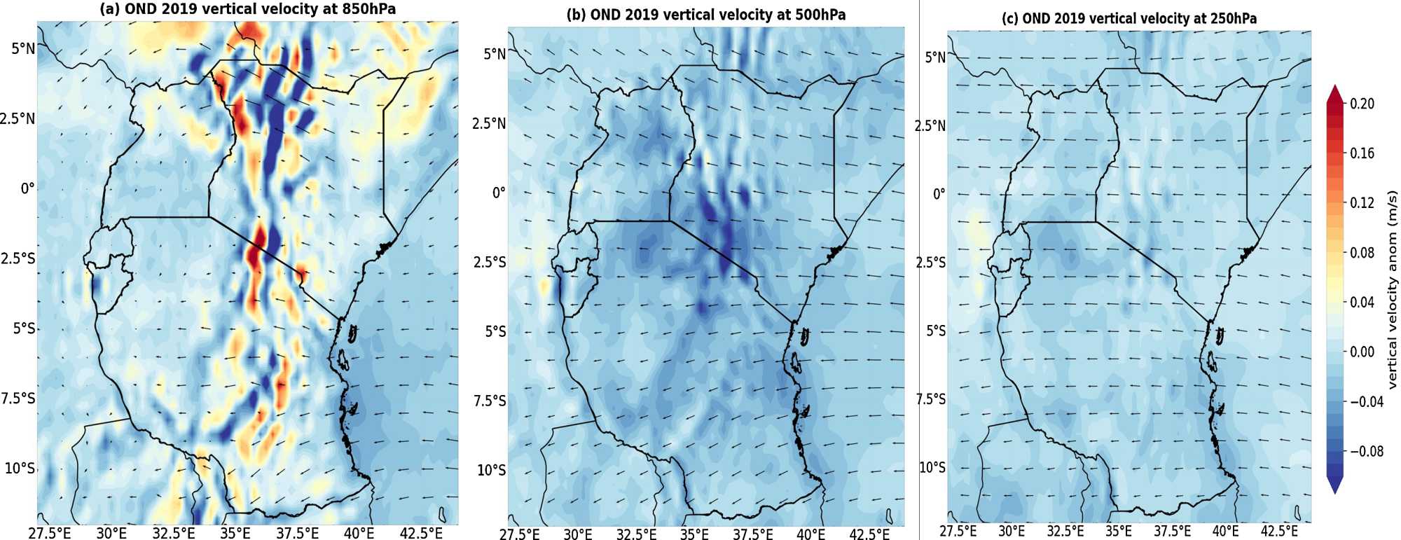 Figure 10. The vertical velocity anomalies with mean wind for the period of OND 2019. (a) at the level of 850 hPa; (b) at the level of 500 hPa; (c) at the level of 250 hPa.