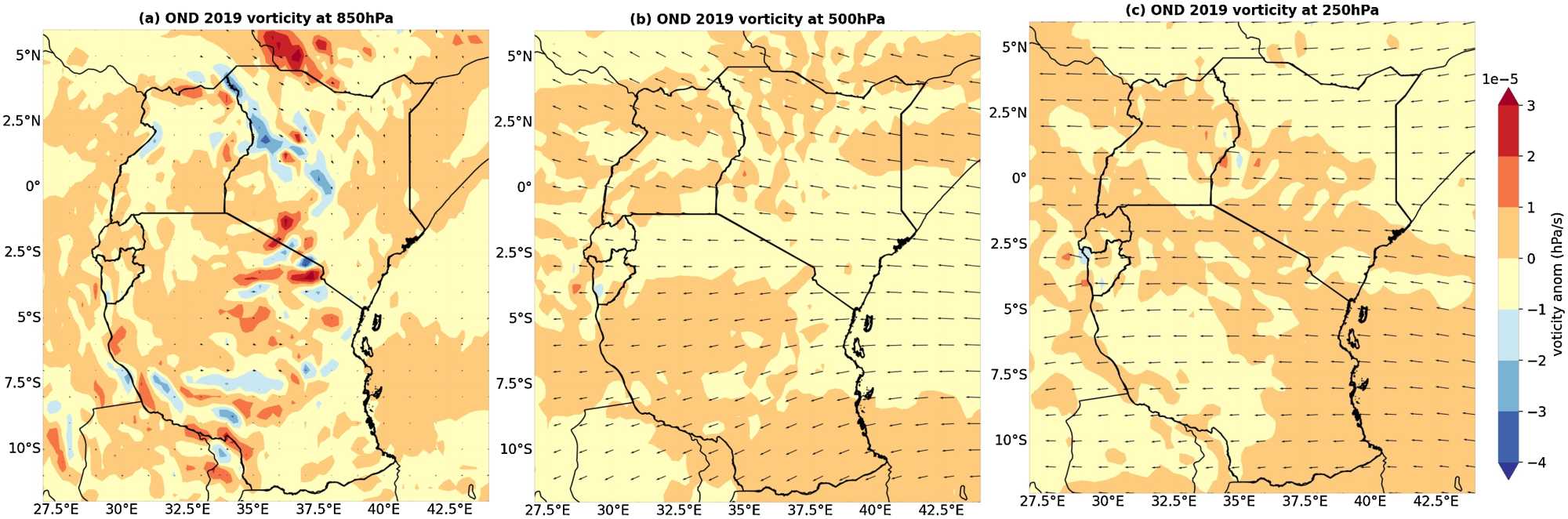 Figure 11 shows the estimated vorticity anomalies at various levels over the timeframe of OND 2019. In the north hemisphere, the vorticity anomalies are negative and contribute to the enhanced rainfall over the northern part of the EA; the positive vorticity at various levels is linked to storms or anti-cyclones at higher altitudes and tends to correspond with troughs in the geopotential height field. Positive vorticity tends to correspond with ridges in the geopotential height field and is linked to calm weather. The positive vorticity anomaly is located over the south hemisphere over EA, which was increasing from the surface to the upper levels, causing the upper atmosphere to become more dynamically unstable, and the arising wind moves upward in vertical motion, resulting in more activities of rainfall over the south hemisphere. The negative vorticity anomaly over the north hemisphere results in convective atmosphere in the in the East Africa region.
