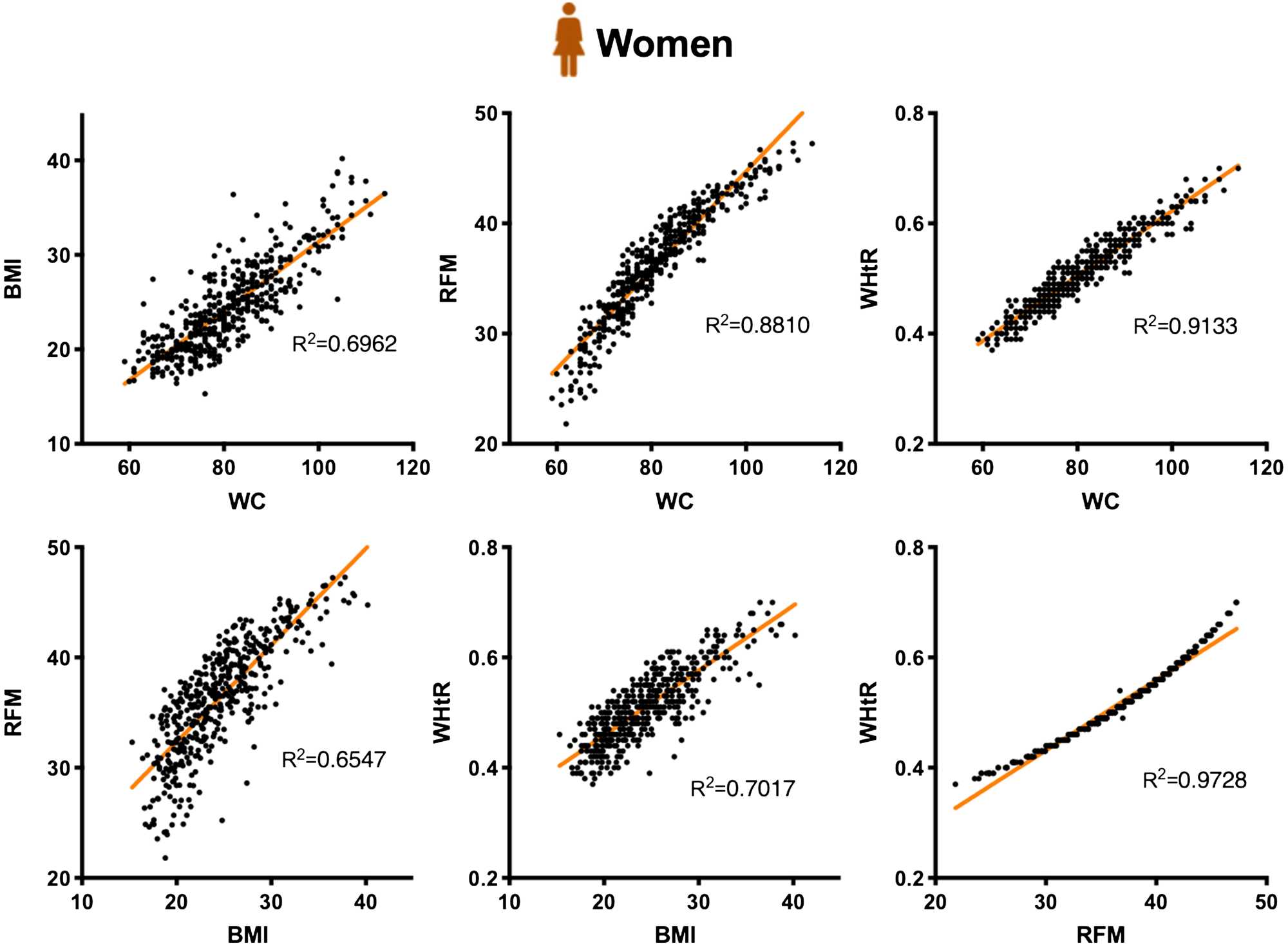 Students were divided by sex and anthropometric determinations were made. As observed in Table 1, subgroups of female students were set according to weight and abdominal obesity; the sample population shows a wide variety and prevalence of the different phenotypes, ranging from underweight to obese, i.e., from the total of 448 participants, 172 were considered within normal weight and waist circumference. When these subgroups were plotted using different pair of indices, the following order of best correlations were obtained: WHtR vs. RFM > WHtR vs. WC > RFM vs. WC > WHtR vs. BMI > BMI vs. WC > RFM vs. BMI (Figure 1).