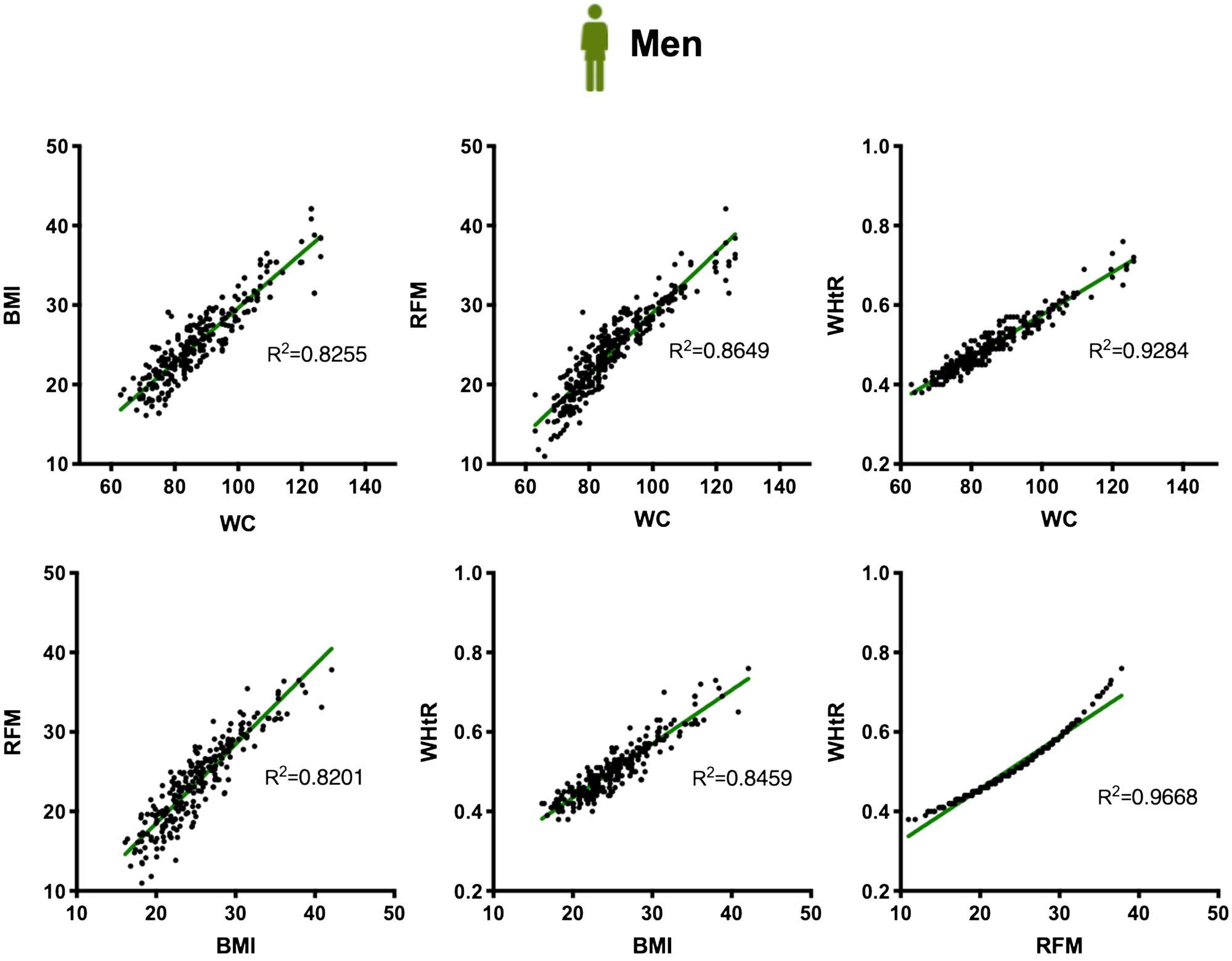 Regarding male students, a similar pattern was observed with the same range of phenotypes as in female students, but there was a lower number (249) of individuals, where 115 were considered within normal weight and waist circumference (Table 2). When these subgroups were plotted using different pair of indices, the following order of best correlations were obtained: WHtR vs. RFM > WHtR vs. WC > RFM vs. WC > WHtR vs. BMI > BMI vs. WC ≥ RFM vs. BMI (Figure 2).