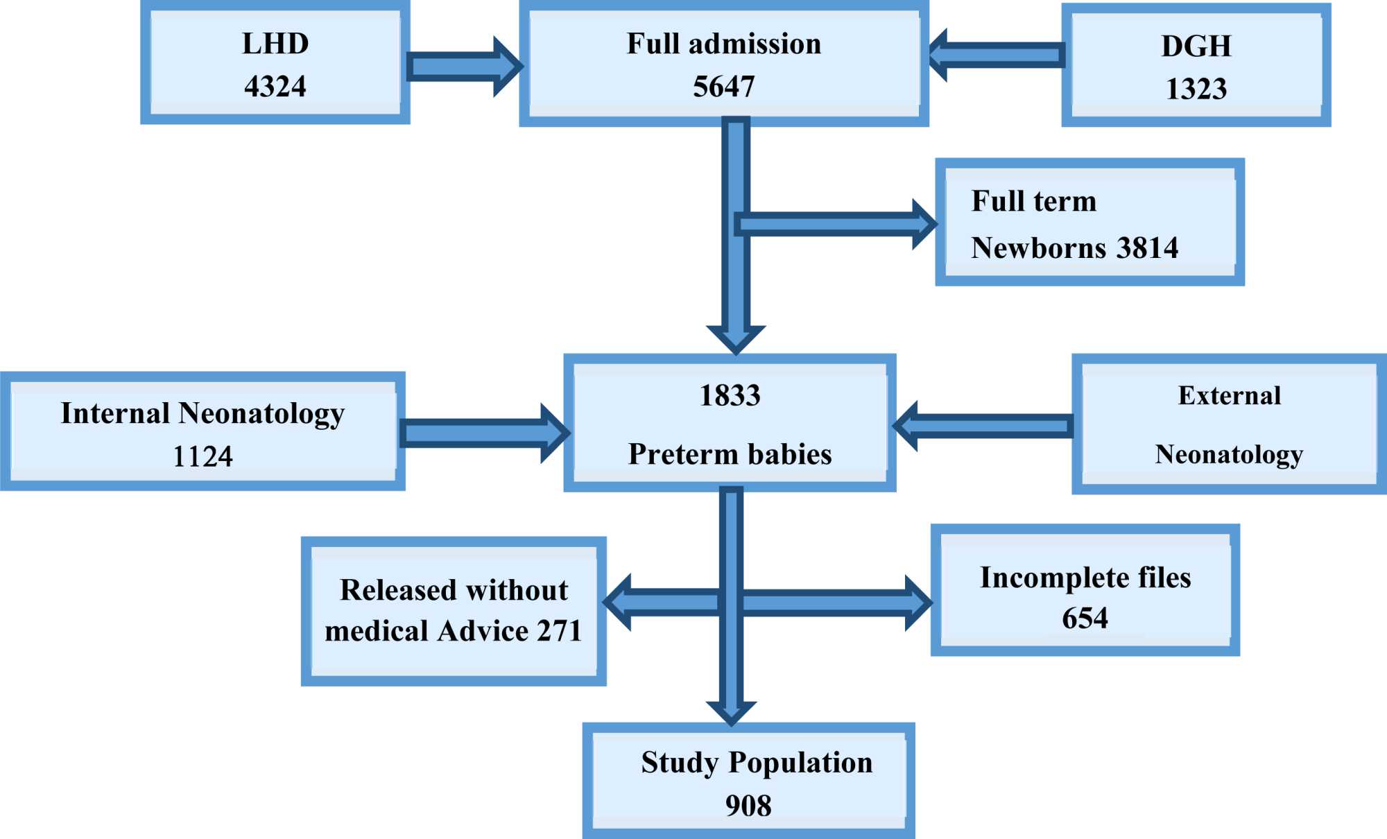All newborns of less than 37 weeks gestational age admitted to the neonatal service of the DGH and HLD were included. Excluded from our study were: Full-term newborns, any inoperable medical record and newborn discharged against medical advice (DAMA).