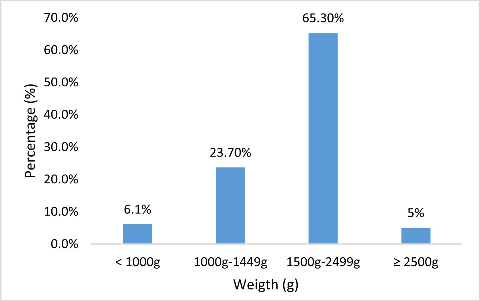 the DGH and LHD maternities, 1124 were premature, an incidence of 10.6%. Gestational age was between 22 and 36 weeks, with a mean of 32.4 weeks. By category, extremely preterm babies accounted for only 5.6%, very preterm babies for 40.6%, and moderate to late preterm babies for 53.7% (Figure 2). The majority of newborns were female, with a sex ratio of 0.96. The birth weight of preterm newborns ranged from 590 to 3200 g, with a mean of 1747 g. Low birth weights (1500 - 2499 g) were in the majority with 65.3% (Figure 3). The majority of preterm newborns were eutrophic (85.5%) at birth, 12.4% were hypotrophy. Among hypotrophic preterm infants, 52.9% were asymmetric and 47.1% symetric hypotrophs.